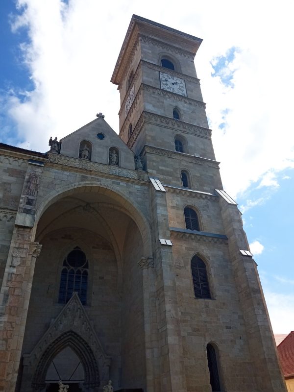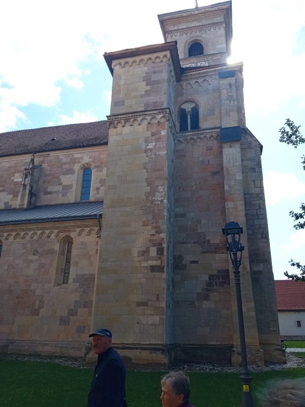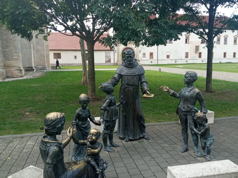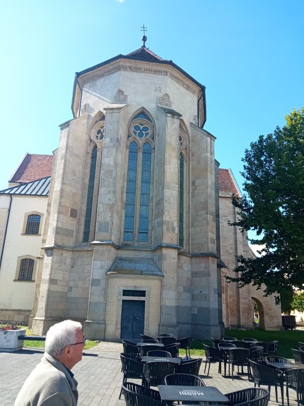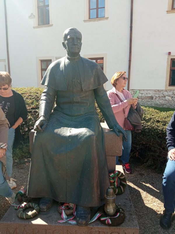 Kirándulásunk az ύjratalálkozás öröme is volt Ft. Dr.Veres Stelian kanonokkal, volt besztercei plébánossal (2008-2012), aki örömmel ismerte fel csoportunk tagjait, szeretettel emlékezett a Besztercén eltöltött négy év szolgálatára és a besztercei római- katolikus gyülekezetre. Megtisztelő mágnesajándékainkat „Jubileum 2025 – A remény zarándokai” köszönettel fogadtuk és Isten áldását kívántuk a kanonok ύr életére és szolgálatára. A jelenlegi püspöki palota udvarán Márton Áron (1896-1980) püspök szobra előtt örök emlékű fényképet készítettünk. A déli órákban étkezési lehetőséget a Szent Ferenc Alapítvány étterme biztosított, ahol a finom ebédet örömmel fogyasztottuk el.