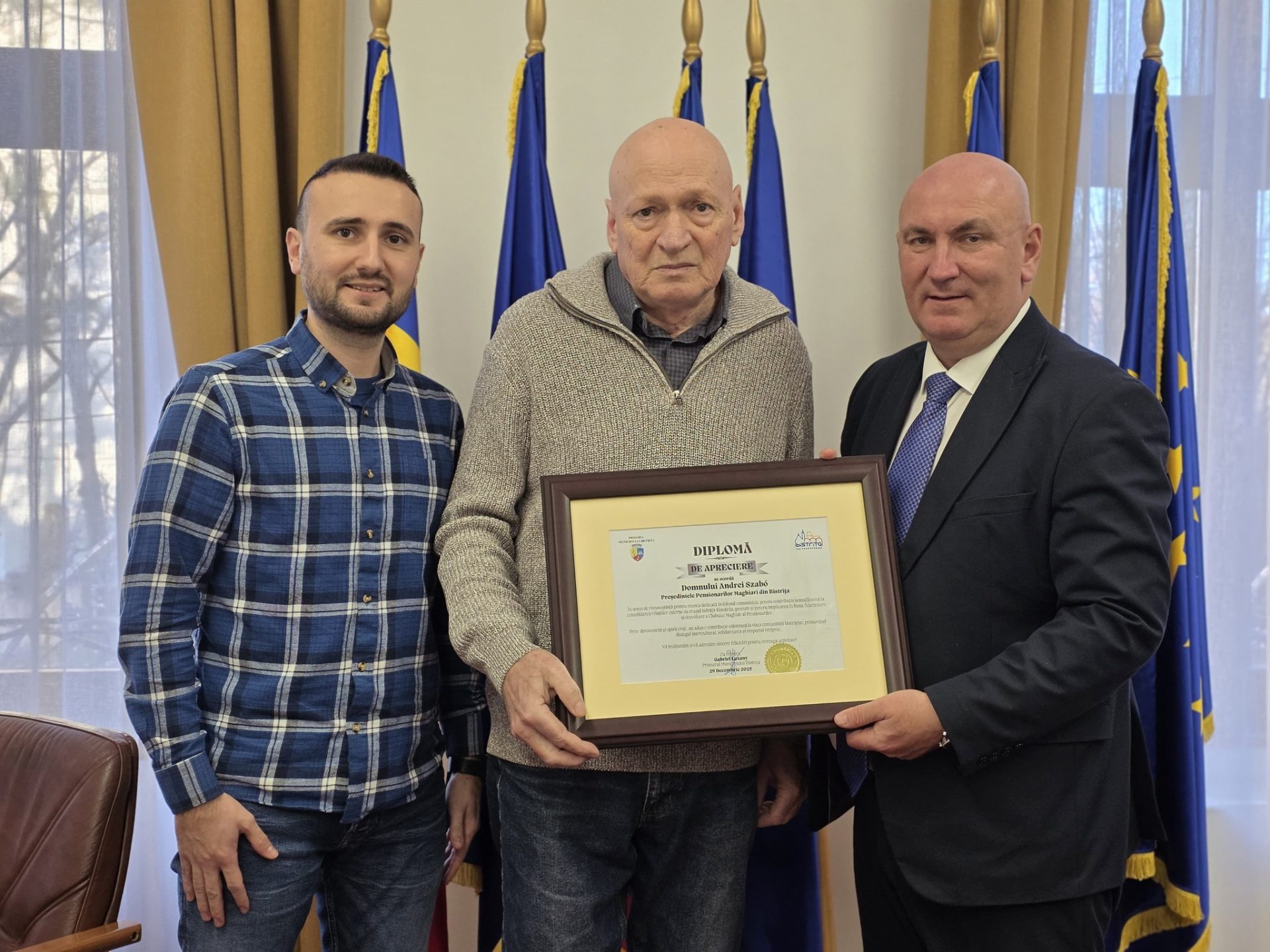 Elismerő oklevelet adott át december 29-én Gabriel Lazany, Beszterce város polgármestere, valamint Máthe Attila, az RMDSZ Beszterce városi elnöke és tanácsosa, Szabó Andrásnak, a Besztercei Magyar Nyugdíjas Klub elnökének.